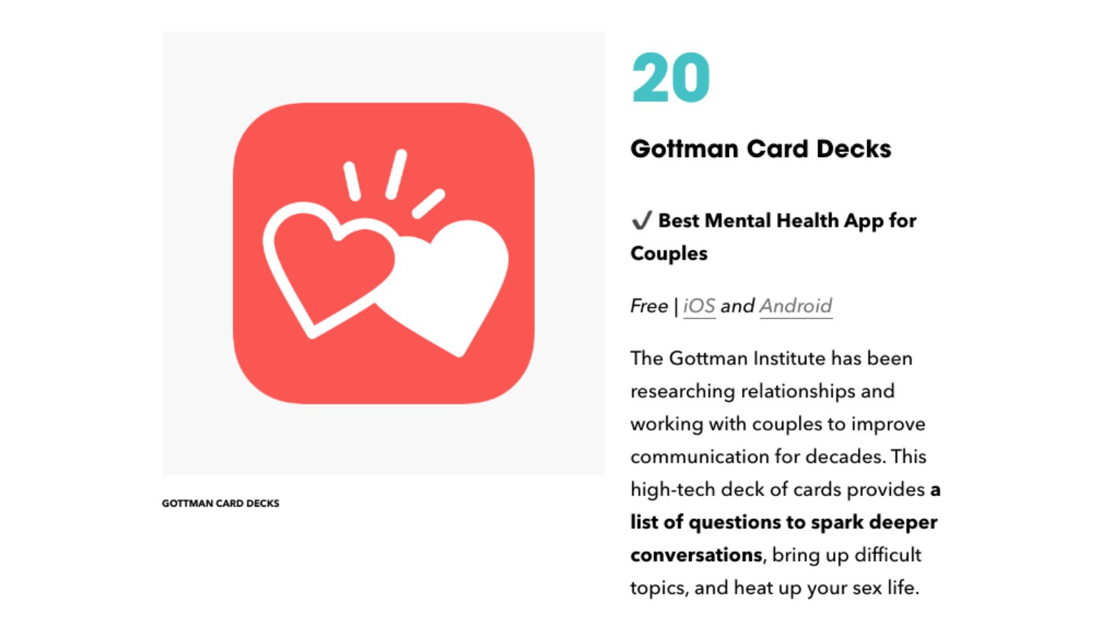 This app has questions you can ask your partner as well as suggestions for things to do and say. The Card Decks app from the Gottmans brings the legitimacy of their expertise to an app-based digital format. Gottman Card Decks See for yourself why millions of couples worldwide have benefited from The Gottman Institutes research-based approach to relationships.